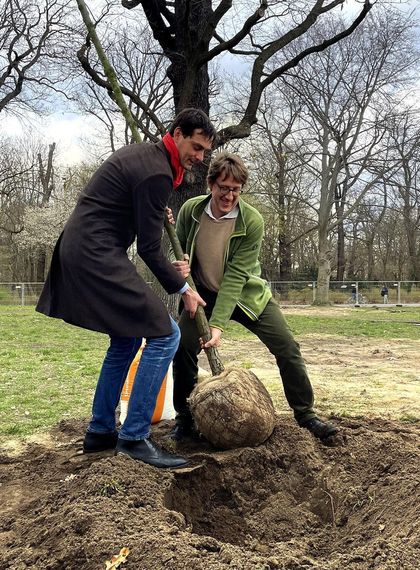 Erster Spatenstich für die klimaresiliente Hasenheide: Stadtrat Jochen Biedermann (Grüne) und Bezirksbürgermeister Martin Hikel (SPD) pflanzen den ersten Baum