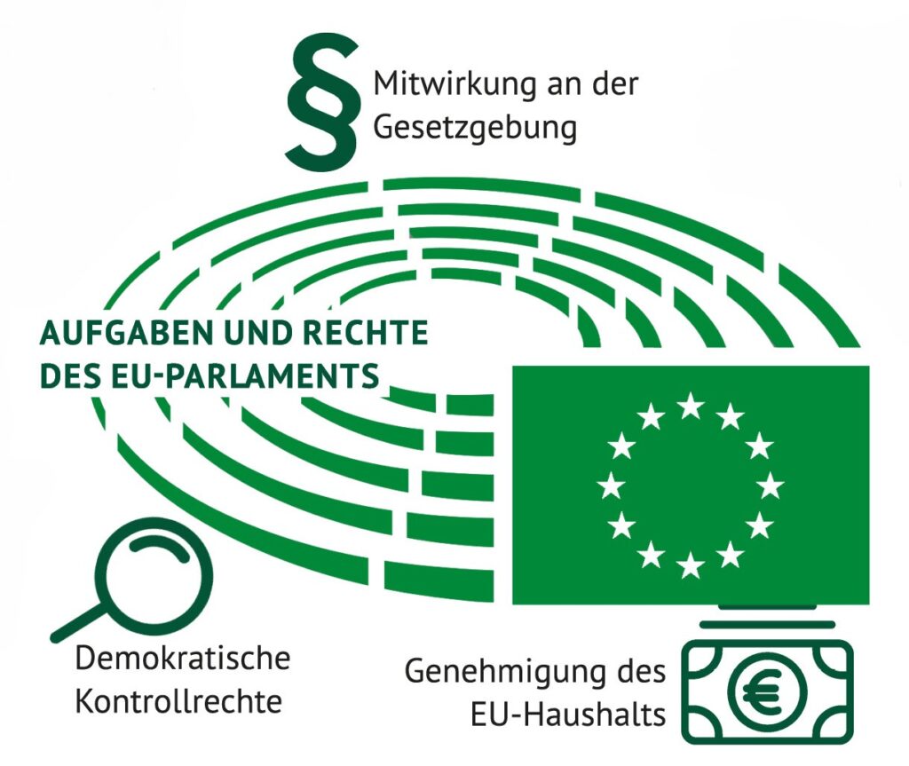 Gemeinsam mit dem Rat der EU, in dem je nach Thema die zuständigen Fachminister*innen der Mitgliedsstaaten zusammenkommen, kann das EP Rechtvorschriften erlassen. Auch kann es Gesetze verabschieden, die jedoch von der Europäischen Kommission vorgeschlagen werden. Das EP hat kein Initiativrecht. Zusammen mit dem Rat der EU entscheidet es über den europäischen Haushalt. Zudem wählt das EP den oder die Kommissionspräsident*in sowie die Kommission in ihrer Gesamtheit.